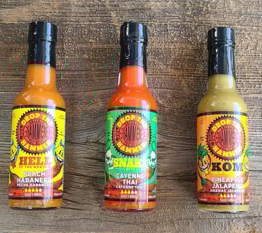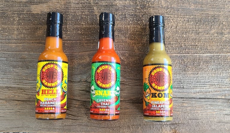 Drop the Hammer" Hot Sauce: Ignited by my cycling passion and love for spice, this blend reflects the spirit of pushing limits – akin to a cyclist dropping the hammer. As my family expanded, we cultivated a garden, fostering a shared love for growing hot peppers. Together, my kids and I crafted hot sauce, delighting in adding it to every dish and sharing it with friends and family. Born from this tradition, each bottle is a flavorful balance and satisfying heat, inviting you to savor the fusion of family, spice, and the thrill of going all out. Embark on an unforgettable culinary adventure with us, unleash the heat!